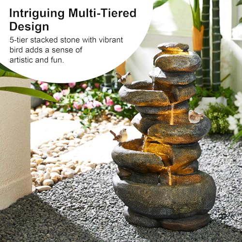 Natural Stone Look Design: Classic cascading rock water fountain featuring natural and realistic lively birds staying on the interesting stacked pebbles design. The 5-tier design lets water come to life that looks vivid and interesting, offers vintage weathered accent. With an antique look, the outdoor fountain brings a touch of rustic charm, the quiet flowing water is sure to make you relaxed and makes a rest for you in the garden