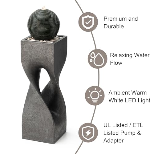 Shallow Shape: The shallow fountain assure birds can drink safely, the sound of the water flow is nature and soothing. With an LED light above the sphere, the streamlined falling water ripples and sparkles in the warm glow, adding visual interest that is sure to transform your garden, patio, or backyard into a tranquil, charming, and delightful environment. Oversized modern and minimalist geometric design, perfect for any modern or zen style garden