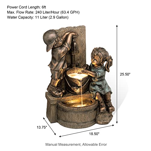 ? Unique Outdoor Decor: The rustic stone water fountain offers vintage weathered accent. With antique children sculptural look, the bronze water fountain brings a touch of rustic charm, the soft sound of cascading water is sure to make you relaxed and makes a rest for you in the garden. The pump can be adjusted to prevent loud water sound.