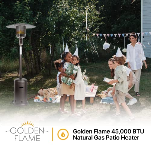 IMPRESSIVE 45,000 BTU’S: With Golden Flame’s XL-Series natural gas heater, you can enjoy being outside even in the coolest of months. The wide reflector hood, crafted from aluminum, is combined with stainless steel burners to generate heat up to a 15-foot diameter. While in use, the heater releases water vapor to help prevent dry air. Ideal for backyards, outside screened-in porches (with proper clearances), restaurant outdoor patios, and more.