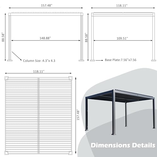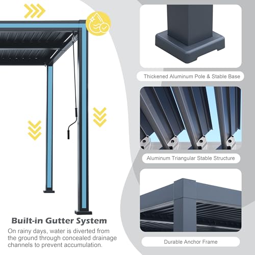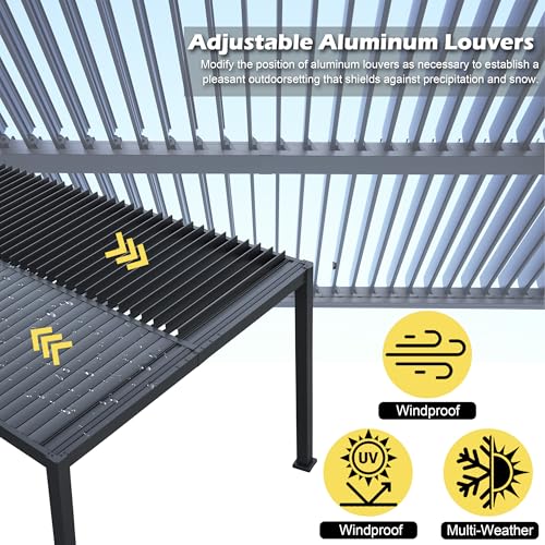 ?High Material & Sturdy Frame?The pergola's frame is constructed from aluminum with a premium powder coating finish. Its canopy roof, made of louvered aluminum as well, offers resistance to rust, ensuring long-lasting durability. The structure boasts reinforced columns that comply with the high industry standards for wind resistance and stability, guaranteeing consistent steadiness.