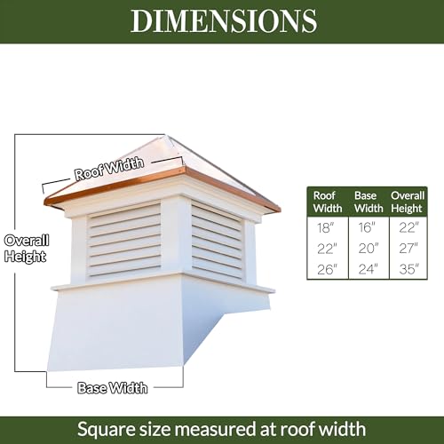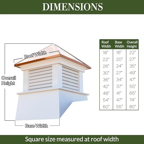 Fits up to a 10/12 pitch roof (most roofs). Builder's rule of thumb: 1.5 inches of cupola width for every foot of unbroken roofline.