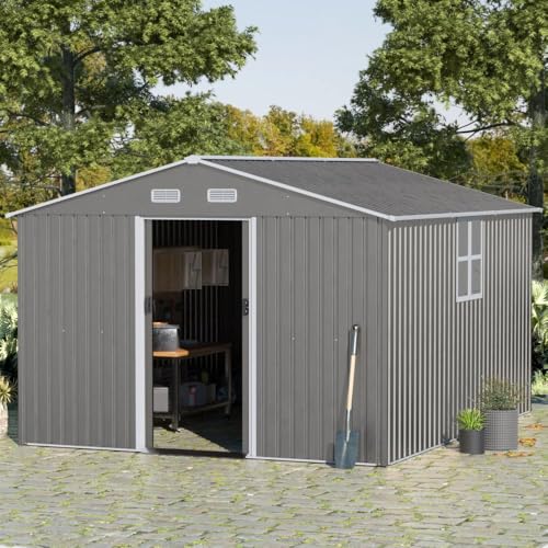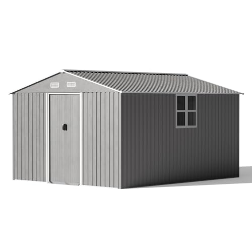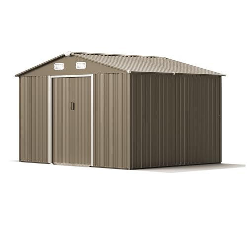 ?10' x 8' large storage shed? 120" L x 96"W x 76.4"H for outdoor shed. This garden shed is perfect for storing snow blowers, lawnmowers, outdoor chairs, bikes, grills, generators, and more. The double-door design easily allows an adult to enter the storage more easily.