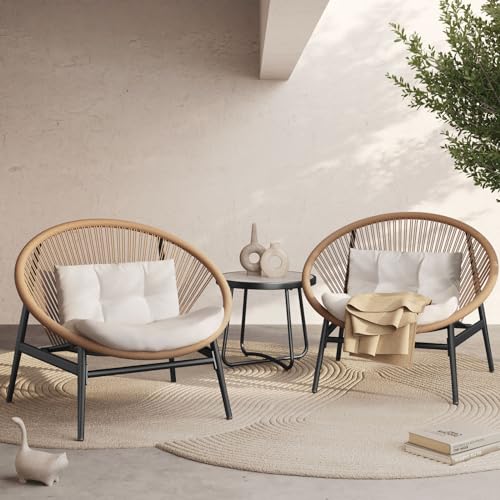 ALL-WEATHER MATERIAL: Our balcony bistro set features a distinctive circular design with natural tones and handwoven rattan in a shell-shape pattern wicker, which is easy to clean, and extremely resistant to the sun, rain, heat, and cold to not crack, sag, or fade. The steel frame with our industry-leading three steps corrosion protection: pretreatment, electrocoating, and powder coating, providing superior durability and toughness