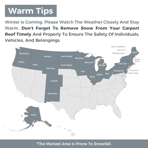 ?Please Note?To ensure the longevity and structural integrity of your metal carport, we strongly recommend promptly removing accumulated snow after heavy winter storms. While our shelter is built to withstand moderate snow loads, excessive weight from wet, heavy snow or prolonged exposure to deep accumulation may risk damage. Stay proactive this winter – a few minutes of maintenance can ensure reliable protection all winter long.