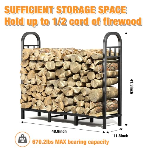 ?Organize Your Firewood in a Neat Stack?: GREENER 4ft firewood log rack measures 4.0*1.0*3.9ft, can easily hold and store a quarter face cord of fire wood. This wood holder is adjustable in length. Perfect size firewood storage rack to fit on outdoor back porch, outside fire pits, back yard deck, wood shed, tool shed, under eaves, indoor garage, by the fireplace, covered patio to hold enough wood for fireplace all seasons