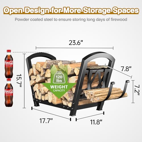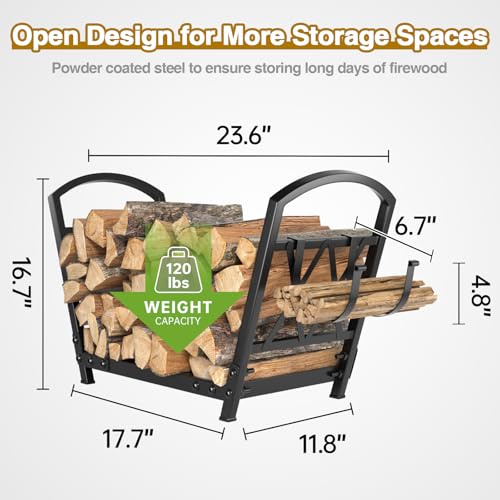 ?Space Saving & Load Capacity?: The unfolded firewood rack is 23.6''(L) x 16.7'' (W) x 11.8'(H)', and can hold about 1-2 days of wood, with a capacity of about 120 pounds. Sturdy kindling wood holder supports hold small things up to 30 lbs. When kindling wood holder is attached to the firewood storage rack frame, it becomes 31.4 inches wide.