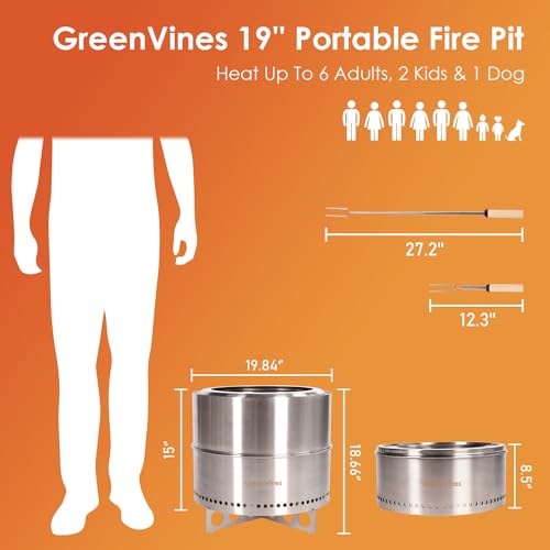?Various Scenarios? Outer Diameter(measure from the base): 19.84’’ | Fire pit Height(without ring & stand): 15’’ | Folding Height: 8.5’’ | Fire Pit Weight: 20.24 lbs | GreenVines' portable 19-inch Fire pit is the perfect companion for gatherings of 6-8 people or for those who enjoy some solo outdoor relaxation. Whether you're camping in the wilderness or simply want to create a cozy atmosphere in your backyard, this fire pit is designed to meet your needs