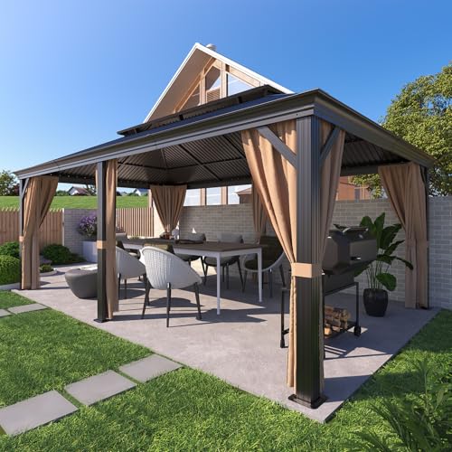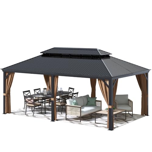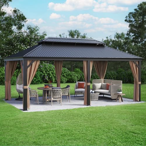 Greesum 12'x20' Hardtop Metal Gazebo, Outdoor Galvanized Steel Double Roof Canopy, Aluminum Frame Permanent Pavilion with Netting and Curtains for Backyard, Patio, Deck, Parties