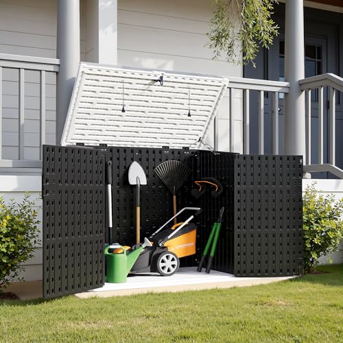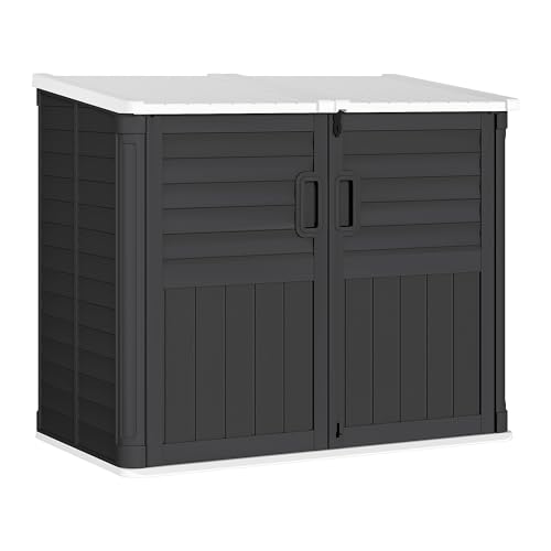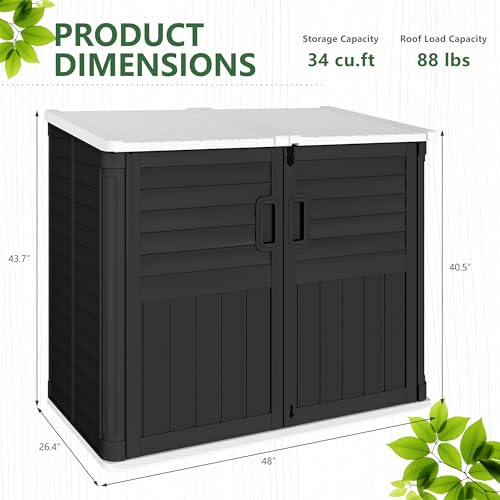 [Large Storage Capacity]: Greesum Outdoor Storage Dimensions: 49.6 in. L x 26.7 in. W x 42.9 in. H. Storage capacity: 34 cubic feet. Can store pool accessories, gardening tools, rubbish bins and other products to meet your daily needs. Product does not include shelves.