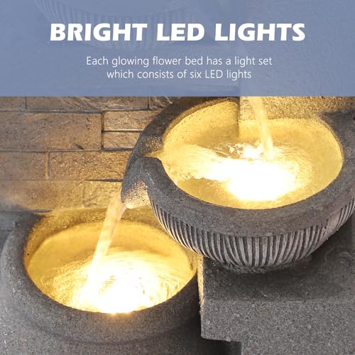 Unique Cascading Waterfalls: Our large garden water fountain consists of 4 tiers, forming 3 waterfalls; 3 warm LED lights lit up the fountain appearance. Built-in warm lights appears particularly elegant