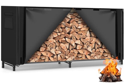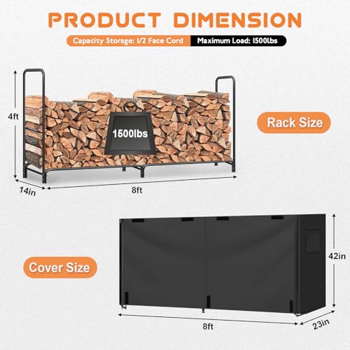 Durable Material: The heavy duty firewood rack measuring 96'' W x 14'' D x 48'' H is made of iron with a black powder coated surface for excellent rust resistance. The cover measuring 96'' W x 14'' D x 42'' H is made of PVC coated 600D Oxford fabric with unique extra patches at the liner seams making it better waterproof. This outdoor wood rack can holds 1/2 cord firewood