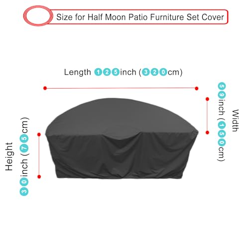 [COVER SIZE]: This particular half moon patio furniture set covers is designed to fit the half moon outdoor sectional.Please see the picture for the size details. The size described in the picture refers to the cover. Before purchasing, check your half moon patio furniture set dimensions for proper fit.