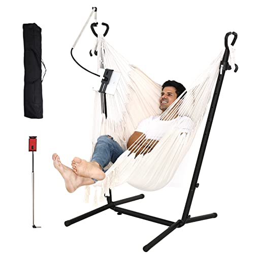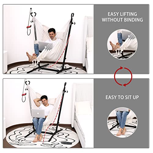 ? [Excellent material technology] It is made of high-quality heavy steel and can easily withstand 400 pounds. The exterior is coated with special black powder, which has weather resistance and rust resistance. It can accompany you for many seasons. The six holes on the suspension chair bracket can adjust the comfortable height and size of the suspension chair at will, which is suitable for suspension chairs of various brands and sizes.