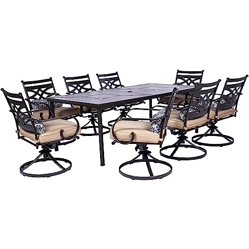Modern Design: This Montclair 9-piece patio dining set includes 8 stylishly stamped back cushioned swivel rockers and a 84"x42" stamped top table all made of heavy duty steel with UV and rust protection for all-weather use