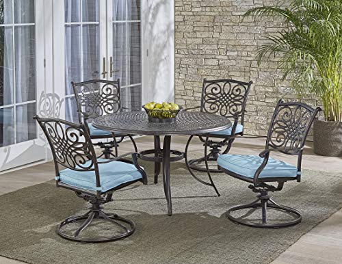 Traditional Design: The Traditions Dining Collection by Hanover includes stylish and elegant cast aluminum scroll chairs and table; This patio dining set for 4 includes brushed bronze cast aluminum swivel rocker chairs and a 48" round dining table
