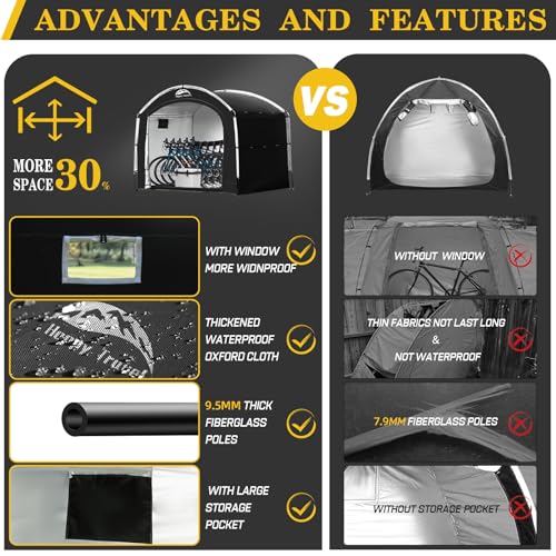 ?Superior Protection?The bike tent outdoor storage waterproof is made of 210D Oxford cloth coated with silver and the stitch of the bike & motorcycle shed are all covered with waterproof tape,which provides excellent waterproof. Our garden shed adopts 9mm thick fiberglass poles make the whole framework stronger.And the bicycle shed is equipped with stakes,so that you can rest easily on rainy days, heavy snow and other weather.