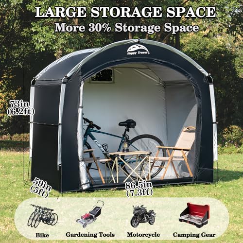 ?Spacious Vertical Storage Sheds?:We have adopted a new vertical design, which gives the bicycle storage shed 30% more storage space than similar semi-circular products which allows you to have more storage space.Our sheds & outdoor storage has been upgraded to a new size, the size of backyard storage reaches 7.3*5*6.2ft.It can accommodate 4 bikes or 2 motorcycles at the same time.