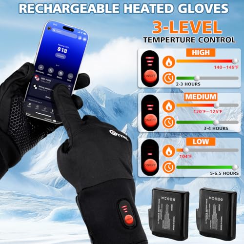 ?Smart Touchscreen & Triple Heating Modes? Designed for modern users, these heated gloves for men/women feature touchscreen-compatible fingertips (thumb and forefinger), allowing seamless use of smartphones without removal. The controller offers three temperature settings (up to 140°F/60°C on high) for customizable warmth in any environment.