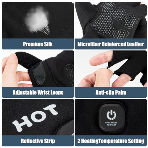 Rechargeable Heated Gloves: These versatile gloves are designed for maximum comfort. With a 2 in 1 full finger and half finger design, and a built in rechargeable battery, you won't need to fuss with cords, ensuring both safety and convenience. The gloves feature a high quality fiber heating element that covers both sides of your hands, providing rapid warmth within 5 seconds of activation, making winter chill a thing of the past.