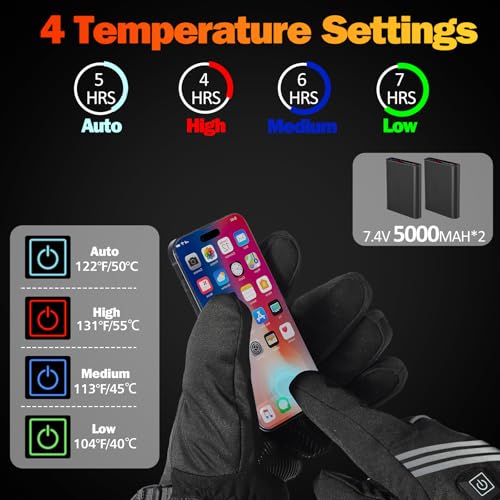 ?4 Temperature Setting & 2*5000mAh Battery?The heated gloves for men have 4 adjustable heating settings(Auto, High, Medium, and Low), from 104°F/40°C to 131°F/55°C, and you can choose the appropriate temperature for different scenarios and weather conditions. The rechargeable heated gloves are powered by a pair of 7.4V 5000mAh rechargeable lithium-ion batteries, with a heating range of 4-7 hours. It only takes 20 seconds to quickly warm your hands.