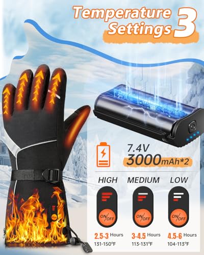 ?3 Heating Settings?: The battery heated gloves have 3 heating levels (high, medium and low), you can adjust the heating level according to your needs. High temperature, 131-150°F, lasts about 2.5-3 hours; Medium temperature, 113-131°F, lasts about 3-5 hours; Low temperature, 104-113°F, lasts about 5-7 hours.