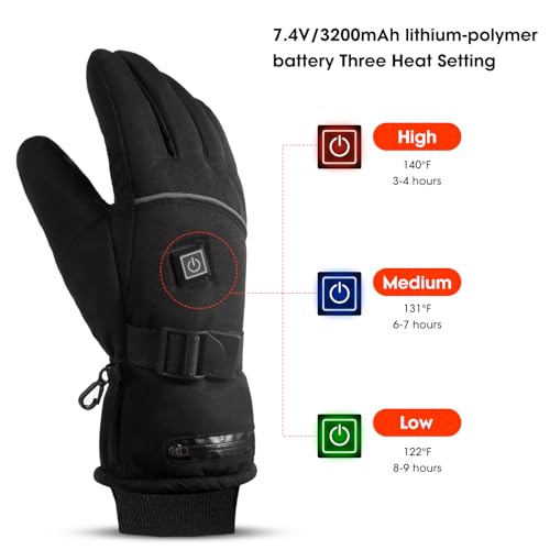 ?Rechargeable Battery-powered ?The heated electric gloves Include pair of 7.4V 3200mAH rechargeable lithium polymer batteries, light weight, easy to carry. Long working hours. Press and hold the button to turn on the heated gloves, Heat spread to the entire hands within 30 seconds after turn on and keep you away from the cold anytim.