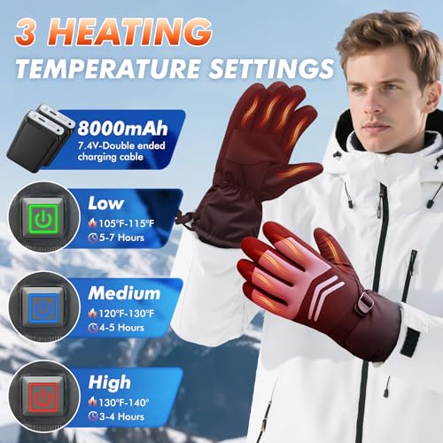 ?Rechargeable Heated Gloves with Extended Runtime?Heated gloves for men feature a built-in 8000mAh(4000mAh per glove) high-capacity battery, providing up to 10 hours of runtime on the lowest setting. The heating elements cover all fingers to the fingertips and extend to the back of the hand. The electric gloves warm hands quickly and provide consistent comfort in cold weather conditions.