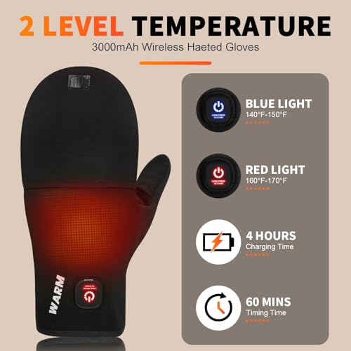 Long Lasting and Safe Power: An internal 3000mAh high capacity polymer battery and upgraded smart chip provide up to 4 hours of continuous warmth for these winter gloves. Fully charges in just 60 minutes for efficient convenience. Easily switch between two temperature settings via the external button: Low (140°F-150°F) and High (160°F-170°F). The timer function prevents overheating at the source, elevating safety standards for greater peace of mind with every use of these heated glives.