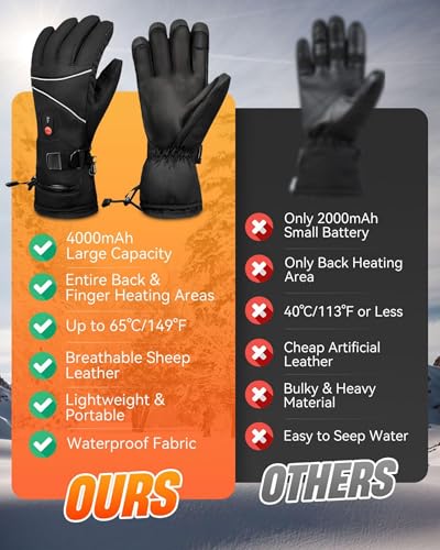 Stay Warm, Stay Connected: Our heated gloves rechargeable not only keep you warm but also enable you to stay connected with touchscreen devices. Stay cozy and active this winter with our exceptional heated gloves! The heated waterproof gloves cotton lining, invisibility heat chip, and reinforced PU leather ensure a soft touch and protect your hands from direct contact with the heating elements.