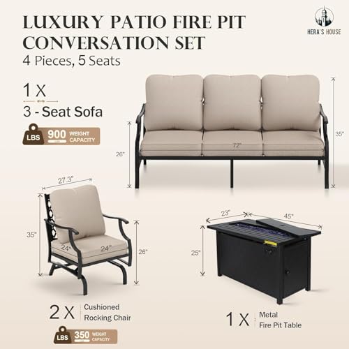 ?A PRACTICAL OUTDOOR FURNITURE SET FOR 5?Including 1 x fire pit table, 2 x metal cushioned rocking chair, 1 x 3 seat sofa. Perfectly fitting with your backyard, poolside, balcony, garden and deck to create an outdoor comfort zone. A REAL PRACTICAL patio conversation set perfectly meet the requirement of enjoying outdoor leisure time like a meal or host a party with your family or friends.