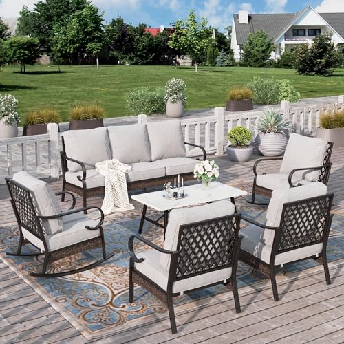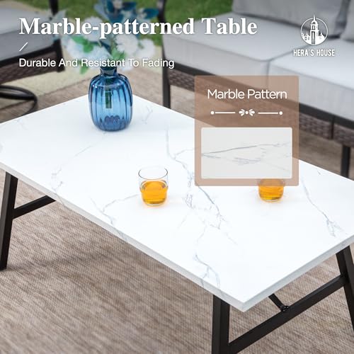 ?EXQUISITE OUTDOOR FURNITURE SET?Including 1 x Marbling Coffee Table, 2 x Rocking Chair, 2 x Fixed Chair, 1 x 3-seat sofa. Unique texture of rattan adds a touch of organic charm to any space, Perfectly fitting with your backyard, poolside, balcony, garden and deck to create an outdoor comfort zone.