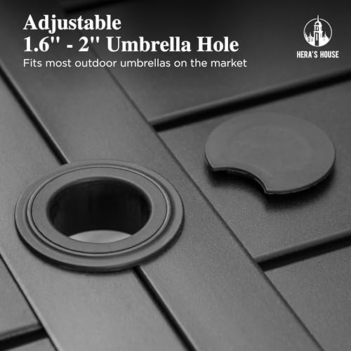 ?MODERN SLATTED METAL TABLE TOP WITH 1.61”/2” UMBRELLA HOLE?1.61”/2” double umbrella hole with solid fixing ring. The excellent metal frame are produced by advanced E-COATING and POWDER-COATING technique which provides extended protection against rust, scratches, rain, and UV harm. Large rectangle surface for 6 people, enough space for your leisure time with your friends or family