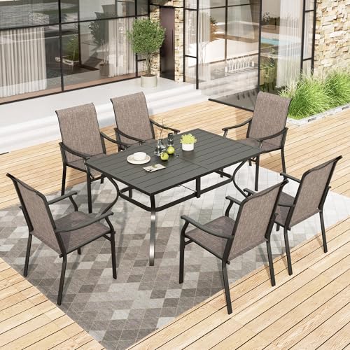 ?A REAL PRACTICAL PATIO DINING SET?Including 1 x outdoor dining table, 6 x Textilene patio dining chairs. Meticulously designed to create a comfortable and stylish outdoor leisure area. Whether it's a balcony, terrace, garden, or patio, we have the ideal furniture set for you. Easy to assemble with clear instructions and all necessary accessories included