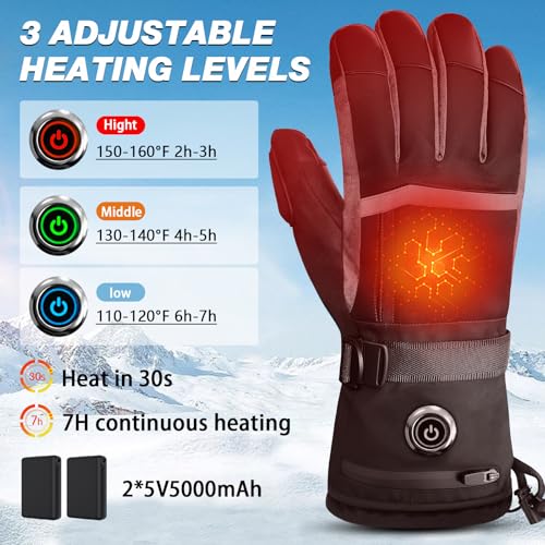 3 Heat Levels & 30s Rapid Heating: The heated gloves support 3 precise temperature levels (Low: Blue light, 110-120°F; Medium: Green light, 130-140°F; High: Red light, 150-160°F), adaptable to various weather conditions and scenarios. Equipped with upgraded heating technology, heated gloves can quickly warm up to the set temperature within 30s, instantly restoring numb hands and allowing effortless control over warmth.
