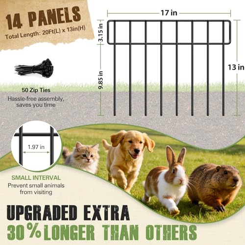 Longer Size for Extended Garden Coverage?This garden fence animal barrier provides wider coverage to protect your outdoor space. Each panel measures 17" long x 13" high, and the set includes 14 pack durable metal panels, creating a total fence length of 20 feet. The longer design helps form a reliable dig barrier fence that can reduce the chances of rabbits, dogs, squirrels, and other small animals digging under your fence and entering your garden