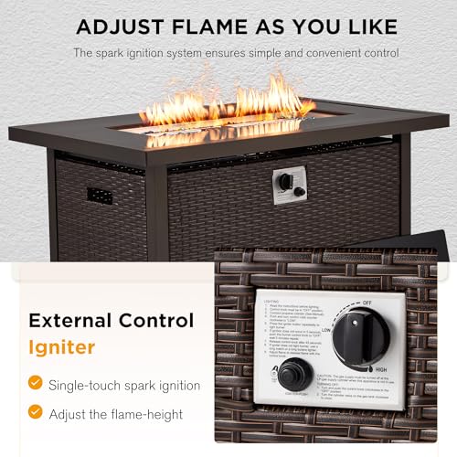 ?Durable & High Quality Material?: The reliable all-weather-resistant PE rattan bring you impressive strength and durability. The frame of our gas fire pit table is made of Powder-coated Aluminum, which is sturdy, rust resistant and heat resistant. The combination of these two materials looks so beautiful and elegant, perfect for your terrace and backyard.