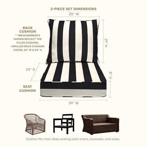 Universal Fit – Separate seat and back cushions with universal style made to fit most outdoor deep seating and patio conversation chairs. Reversible design allows for use on either side. Seat: 24" W x 23" D; Back: 24" W x 21" H.