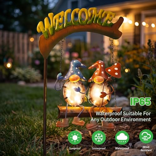 ?Gnomes Patio Decor?The unique and original fairy gnome swing design, with the gnome partner holding the mushroom playing on the swing with the word "Welcome", makes your garden full of vitality and fun