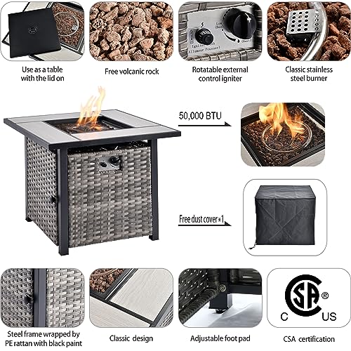 FirePit Table Included: Comes with a square convertible gas fire pit table. Night time use as a fire pit table to add atmosphere. Day time use as a tall Dining table with the burner lid. Stainless Steel Burner withstands all weather. CSA certificated for safety. With lava stone for brighter flame