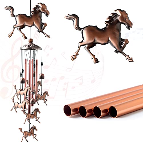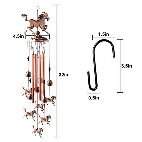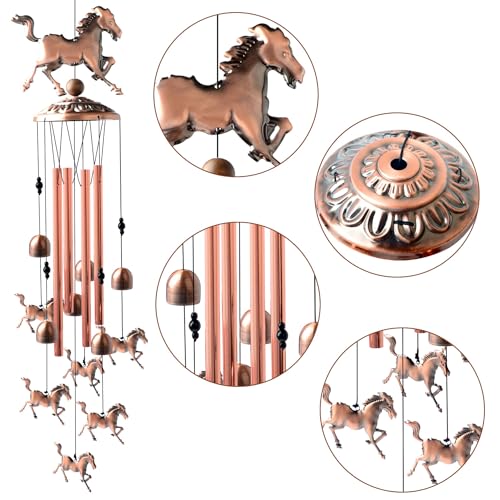 ?????UNIQUE DESIGN?Copper Horse wind chimes, pure hand-made with a strong metal top, 4 bronze durable aluminum tubes,6 small lucky Horse , 1 big lucky Horse . 6 copper balls ,Each metal tube has its own unique tone when it collides.Made of aluminum, it provides beautiful and harmonious sound, and brings clear and pleasant ring to anywhere.When the sun rises, beautiful sunshine is reflected from the the wind chime. Listening to beautiful music in the breeze makes you very relaxed and comfortable.