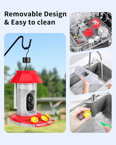 ?Easy Refilling and Cleaning?For the health of the birds, the hummingbird feeder is made of high-quality BPA-complimentary plastic. The hummingbird feeder is machine washable (camera needs to be taken out) and comes with a cleaning brush to clean every corner of the bird feeder.