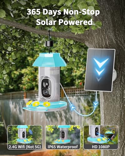 ?Solar Panel & Rechargeable Battery Powered?The camera has a built-in 5200mah rechargeable battery and an external 3W solar panel, making full use of sunlight to achieve 365-day uninterrupted battery life. There is no need to worry about the camera losing power and stopping working, giving you more time to watch birds. The bird feeder camera supports a more stable 2.4G Wi-Fi connection (5G Wi-Fi is not supported).