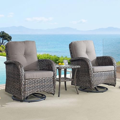 Swivel Rocking Chairs:Resting on chairs with sturdy round metal base allows to glide gently and swivel 360° for relaxing, with seat and back cushions contribute to comfortable support, making the outdoor set a perfect addition to transform your patio.