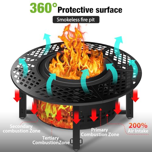 ?MORE EFFICIENT FLAME & SMOKELESS? Designed for innovative Dual Fuel Grate, Our smokeless firepit allows you to choose between wood or pellets that features flexibility for different preferences. With Signature 360° Airflow, the fire pit table top flames will burn ultra-hot whether you’re burning pellets or wood, getting hotter than conventional fires, greatly reduced smoke produce.