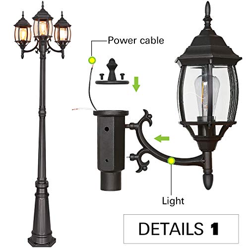 ?CLASSIC TRADITIONAL STYLE:The lamp post features a traditional design. Made from sturdy cast aluminum with clear glass panels and an elegant black finish which adds the perfect touch.The 3-headed post light will help bring more brightness for your way home.