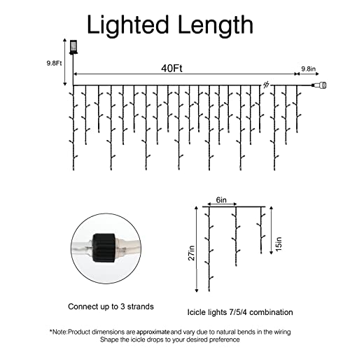 Easy to Install: The white Christmas Lights 40 feet lighted length. 9.8 feet lead cable is long enough to plug into power supply. LED icicle string lights are perfect decorations for Christmas outdoor, roof lines, porch fences, railings, window, bedroom, courtyard, balcony, gazebo, canopy, wedding, etc