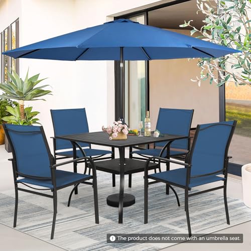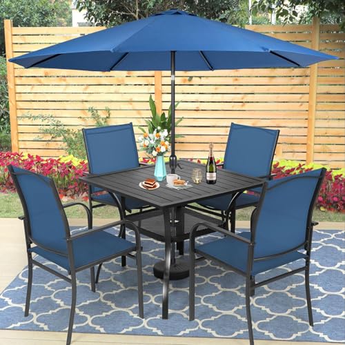 ?Outdoor patio furniture set? Incburce patio set including 4 textilene chairs, 1 umbrella and 1 outdoor dining table with umbrella hole.Table Size: 37" W x 37" D x 28" H; Chair Size (4): 22.6" W x 20.8" D x 36.2" H. The modern design is perfect for your patio, garden, lawn and yard