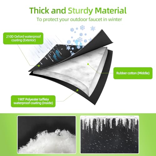 ?Against freezing & Waterproof Material?: The thick hose bib insulation covers protect your outdoor faucets from freezing, bursting and blowouts under the severe weather conditions, like snow, rain, wind and sun exposure heating, helping you save expensive maintenance costs.