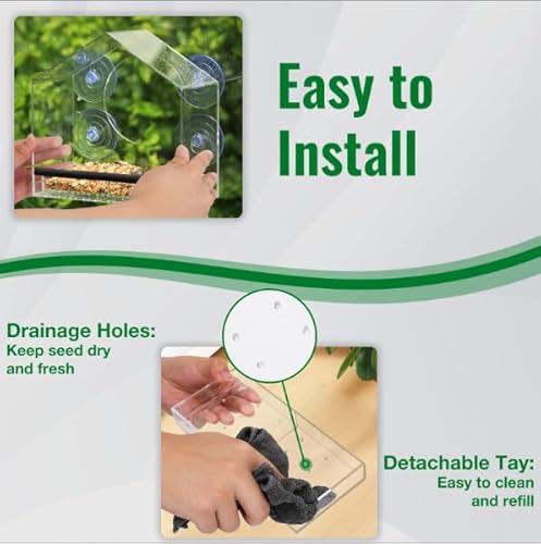 ?Detachable Tray Drain Design? Our window bird feeder tray has food troughs with drainage holes on both sides and a sink in the middle, which can meet the feeding and drinking needs of birds at the same time. The drainage hole design can keep bird food dry and fresh.